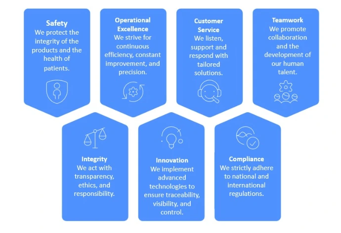 Garantizar soluciones logísticas integrales, seguras y eficientes para la industria farmacéutica y de dispositivos médicos, asegurando el manejo adecuado, la trazabilidad y el cumplimiento regulatorio en cada etapa de la cadena de suministro. Nuestro compromiso es preservar la integridad del producto y brindar un servicio ágil, confiable y orientado al cliente.
